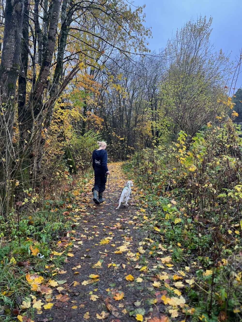 Som frivillig går du på luftetur med en hund, sammen med beboere og andre frivillige ved gården.