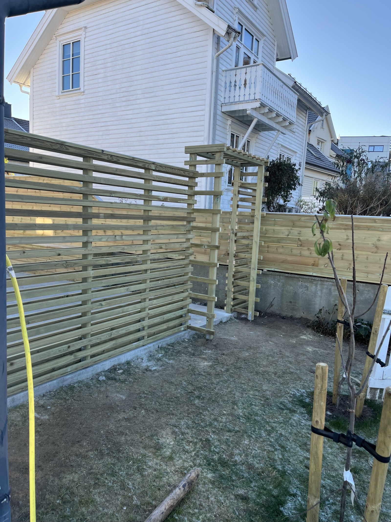 Som et blikkfang ved inngangen til hagen ble det bygget en pergola til klatreplanter, som over tid vil gi et grønt og levende uttrykk. I tillegg laget de en romslig blomsterkasse som gir gode muligheter for beplantning, samt to trapper som sikrer trygg og god adkomst.