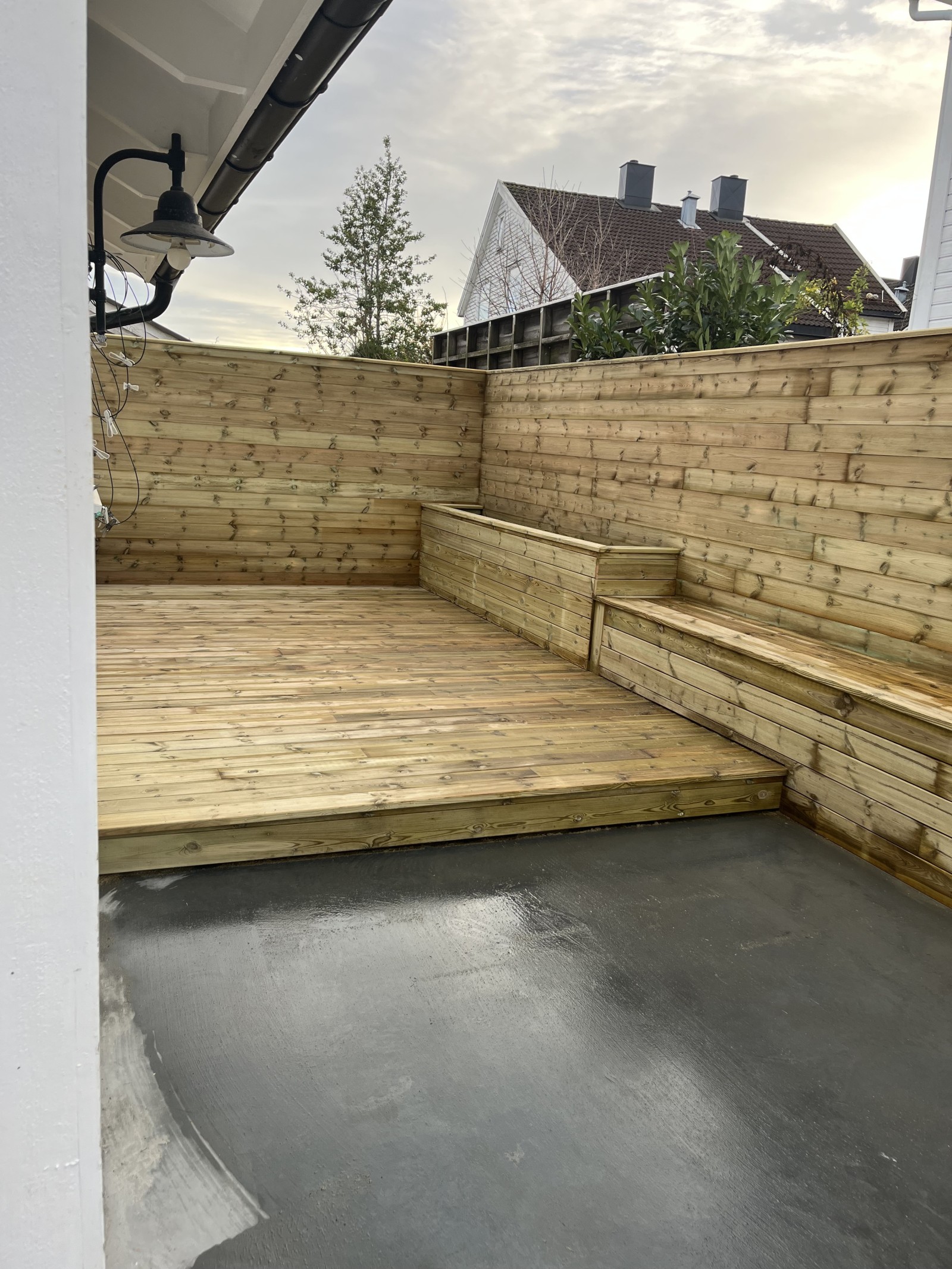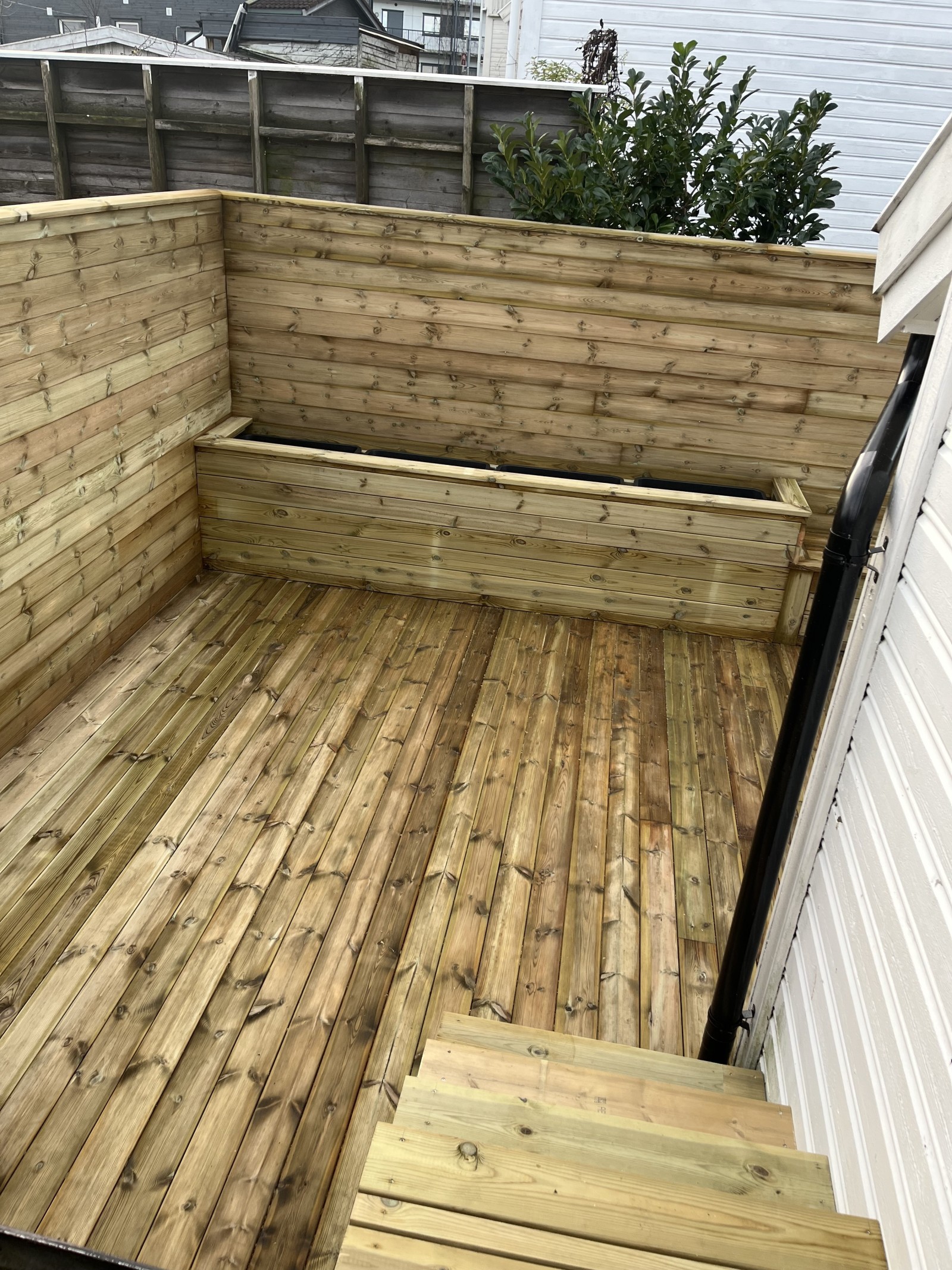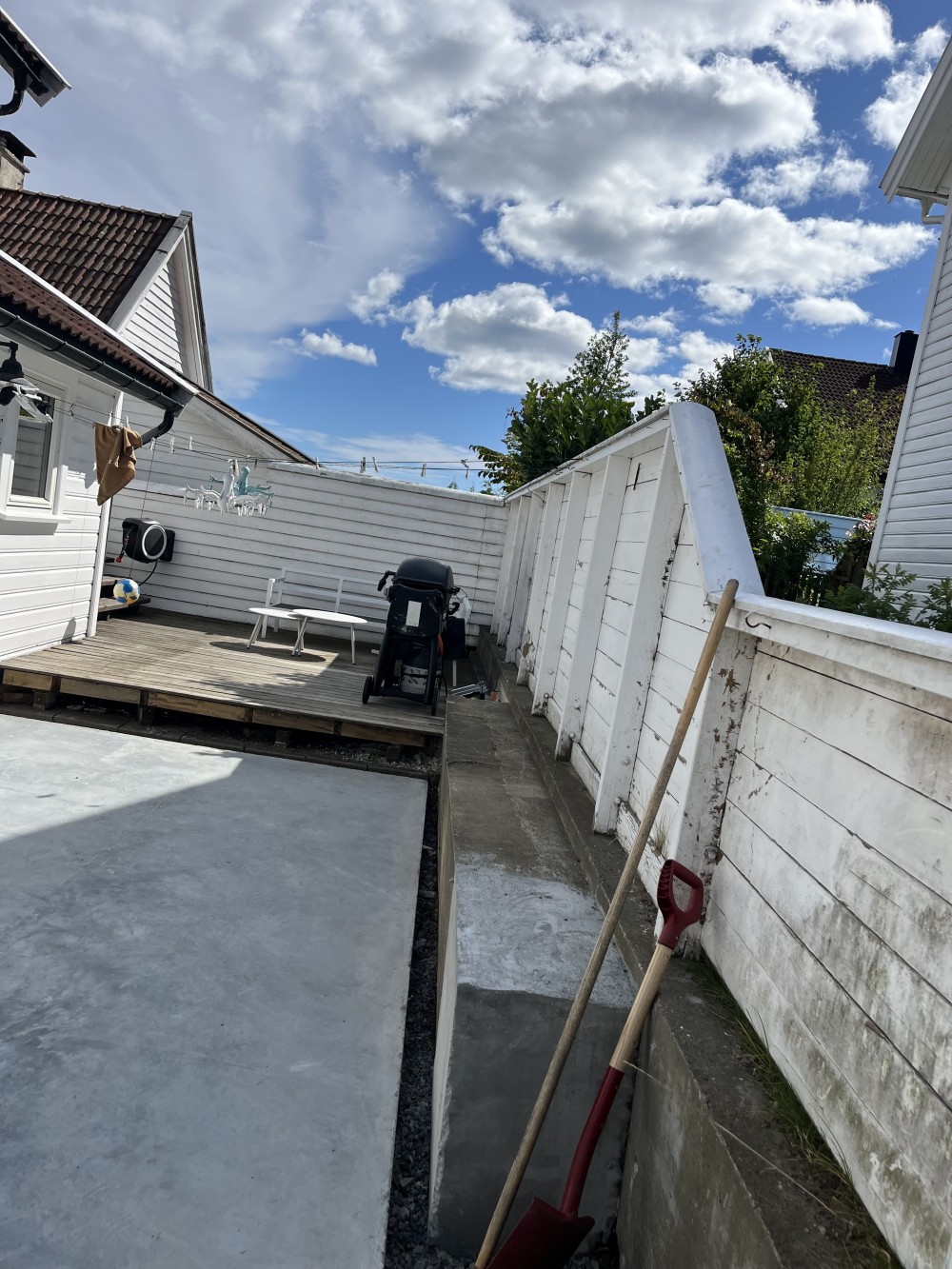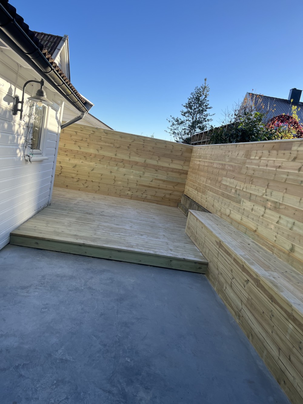 Mot naboeiendommen bygget de ny skillevegg med panel, som både gir bedre innramming, økt privatliv og et ryddig, moderne uttrykk. Videre ble det satt opp nytt reisverk og platting, tilpasset terrenget og kundens behov for soner i hagen.
