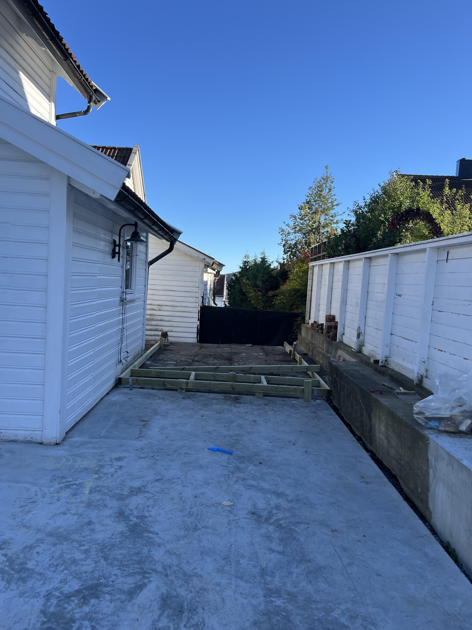 En sentral del av prosjektet var å skjule en eksisterende mur som ikke ga et pent uttrykk. Dette ble løst ved å ramme inn området på en gjennomtenkt måte med å lage en sittebenk langs plattingen slik at dette ble en naturlig del av hagen og ikke et blikkfang.